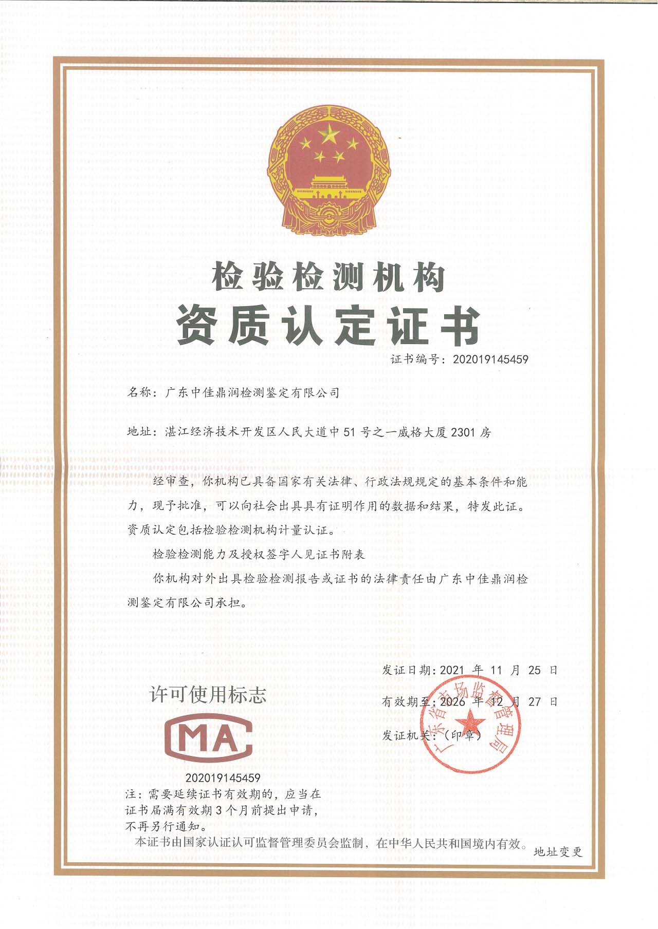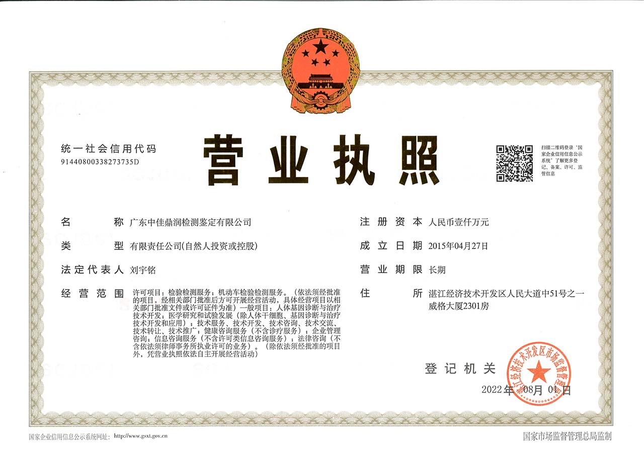 广东中佳鼎润检测鉴定有限公司(英文名字:Guangdong Zhongjia Dingrun Testing And Identification Co.,Ltd),办公场所位于湛江经济技术开发区人民大道中51号之一威格大厦2301房,注册资本一千万,营业范围:检验检测服务;机动车检验检测服务。(依法须经批准的项目,经相关部门批准后方可开展经营活动,具体经营项目以相关部门批准文件或许可证件为准)一般项目:人体基因诊断与治疗技术开发;医学研究和试验发展(除人体干细胞、基因诊断与治疗技术开发和应用);技术服务、技术开发、技术咨询、技术交流、技术转让、技术推广;健康咨询服务(不含诊疗服务);企业管理咨询;信息咨询服务(不含许可类信息咨询服务);法律咨询(不含依法须律师事务所执业许可的业务)。(除依法须经批准的项目外,凭营业执照依法自主开展经营活动)