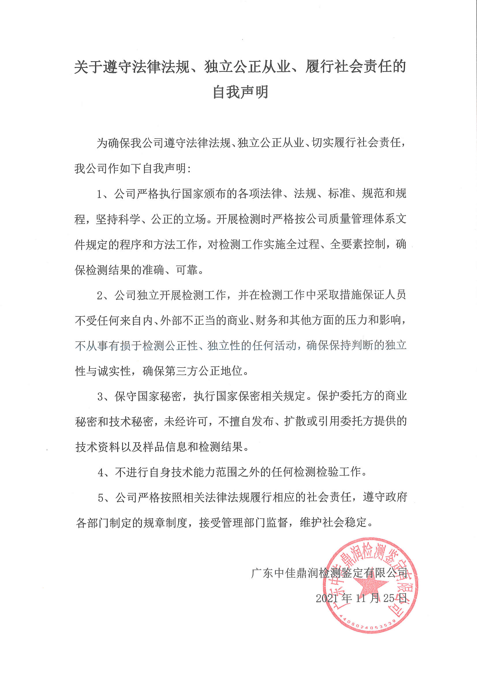 本公司一直重视自身的建设和发展,不断改善办公条件和检验检测环境,遵守职业道德,规范执业行为,努力把本公司建设成为具有公正性、科学性、权威性的第三方检验检测机构,为国家的经济发展和社会稳定发挥应有的作用。