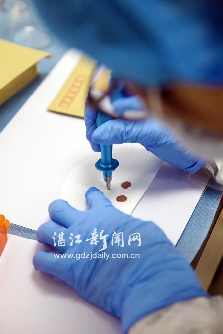 工作开始了,梁工程师细心地给离心管一一标注,将鉴定者的信息进行编号,用取样器将白纸上的血迹取出后,放入离心管中,并注入H2O(水),盖上离心管的盖子。一个家庭的提取工程花时约5分钟。