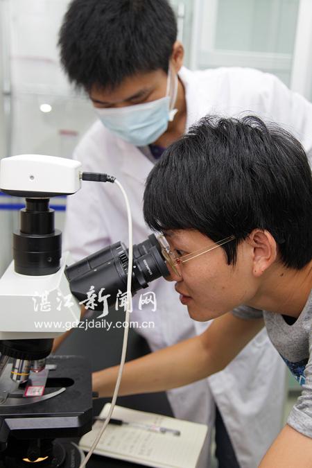 记者通过显微镜观察病变组织