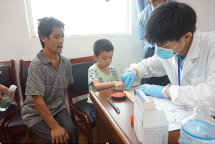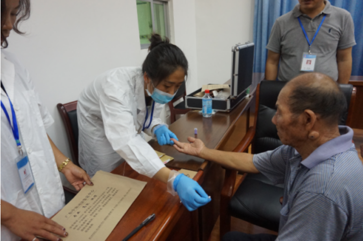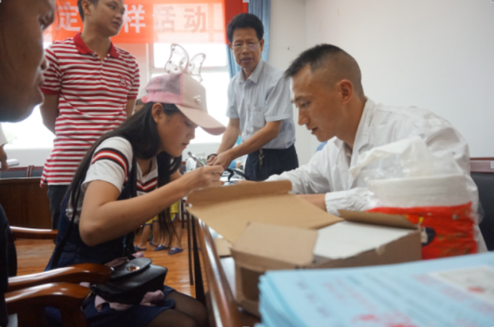 采集点现场,贫困户人员在工作人员的指引下,填写委托鉴定书,并在《检材采集单》上签名、按手印。随后,工作人员拿出采样器材,通过手指采血方式,分别采集被鉴定人的血痕样本,并封存到样本卡里待检测。样本采集时,工作人员还为当事人及所采集的样本进行拍照,确认样本采集过程合法性。