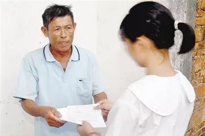 养父李军(化名)从寻亲女孩的手中接过户籍卡。记者 刘冀城 摄