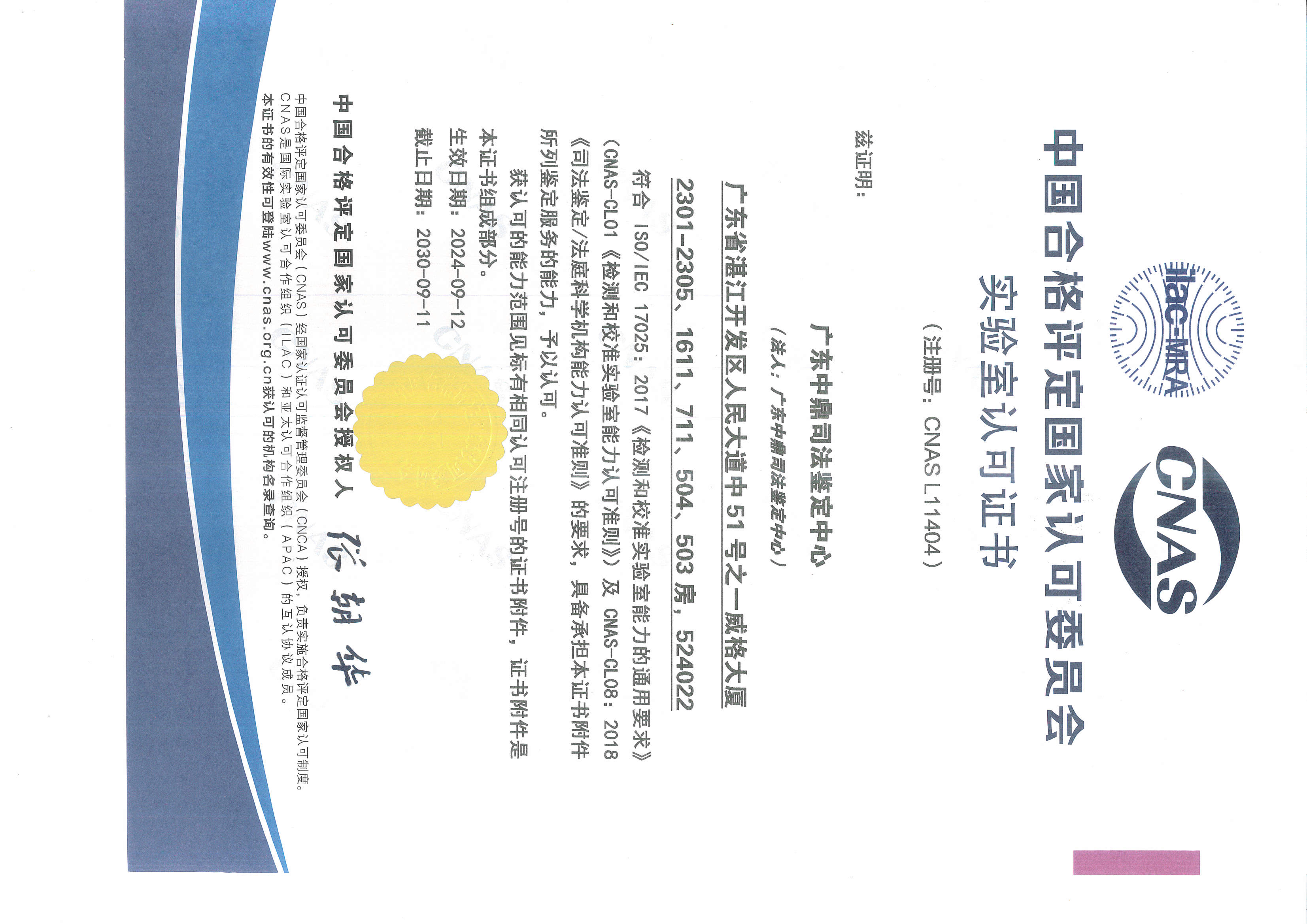 我中心于2007年获得广东省司法厅批准开展文书、痕迹鉴定至今已执业满17年,2012年获批法医临床鉴定至今已执业满12年,2016年获批法医病理、法医毒物、法医物证至今已执业满8年,2020年9月获批图像鉴定至今已执业满4年,2018年9月12日我中心通过CNAS实验室认可(注册号:CNAS L11404),2020年12月28日我中心通过CMA计量认证(证书编号:202019145459)。