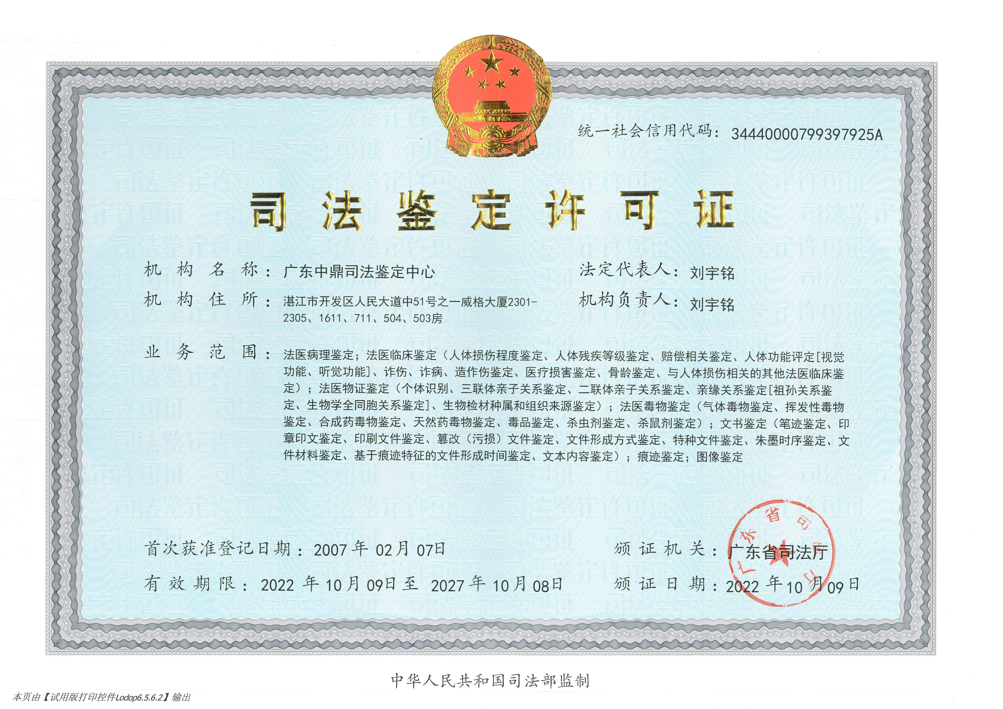 本中心于2007年2月成立,名称为“广东中鼎文书鉴定司法鉴定所”,2013年因业务扩项,经广东省司法厅审核同意,变更为“广东中鼎司法鉴定所”,2016年3月因再次业务扩项,经广东省司法厅审核同意,变更为“广东中鼎司法鉴定中心”,统一社会信用代码:34440000799397925A。目前鉴定业务有:文书鉴定、痕迹鉴定、法医临床鉴定、法医毒物鉴定、法医病理鉴定、法医物证鉴定、图像鉴定七大类。