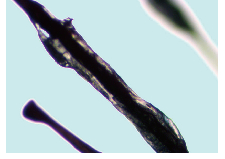 头发末端可看见清晰 的毛囊,将毛发在室 温条件下进行干燥 |